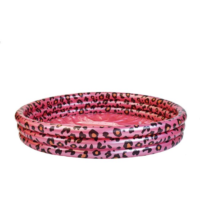 Dit rosé panterprint zwembad heeft 3 luchtkamers, en is 150 cm doorsnede.